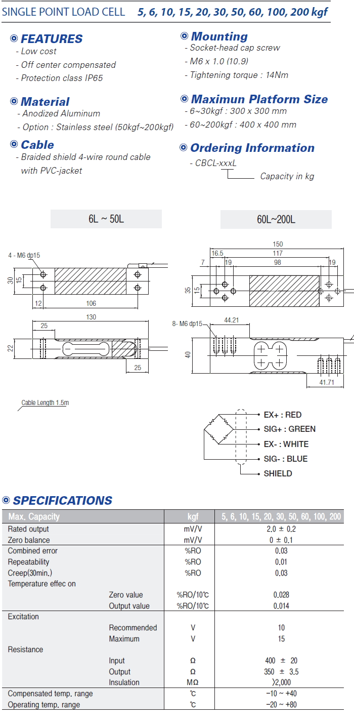 Best price, high service FEATURES - Low cost - Off center compensated - Protection class IP66 MATERIAL - Anodized Aluminum - Option : Stainless steel (50kgf~200kgf) CABLE - Braided shield 4 - wire round cable with PVC - jacket MOUNTING - Socket - head cap screw - M6 x 1.0 (10.9) - Tightening torque : 14Nm MAXIMUM PLATFORM SIZE - 6~30kgf : 300 x 300mm - 60~200kgf : 400 x 400mm ORDERING INFORMATION - CBCL-xxxL CONTAC : www.ktech.com.vn EMAIL : ktech102@gmai.com PHONE : 08 - 6292 - 4220